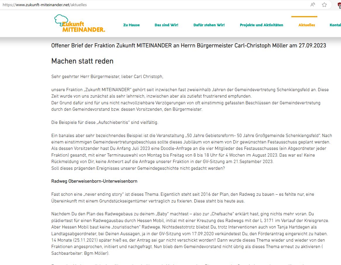 Im September 2023 hat die Fraktion "Zukunft-MITEINANDER" einen "Offenen Brief an