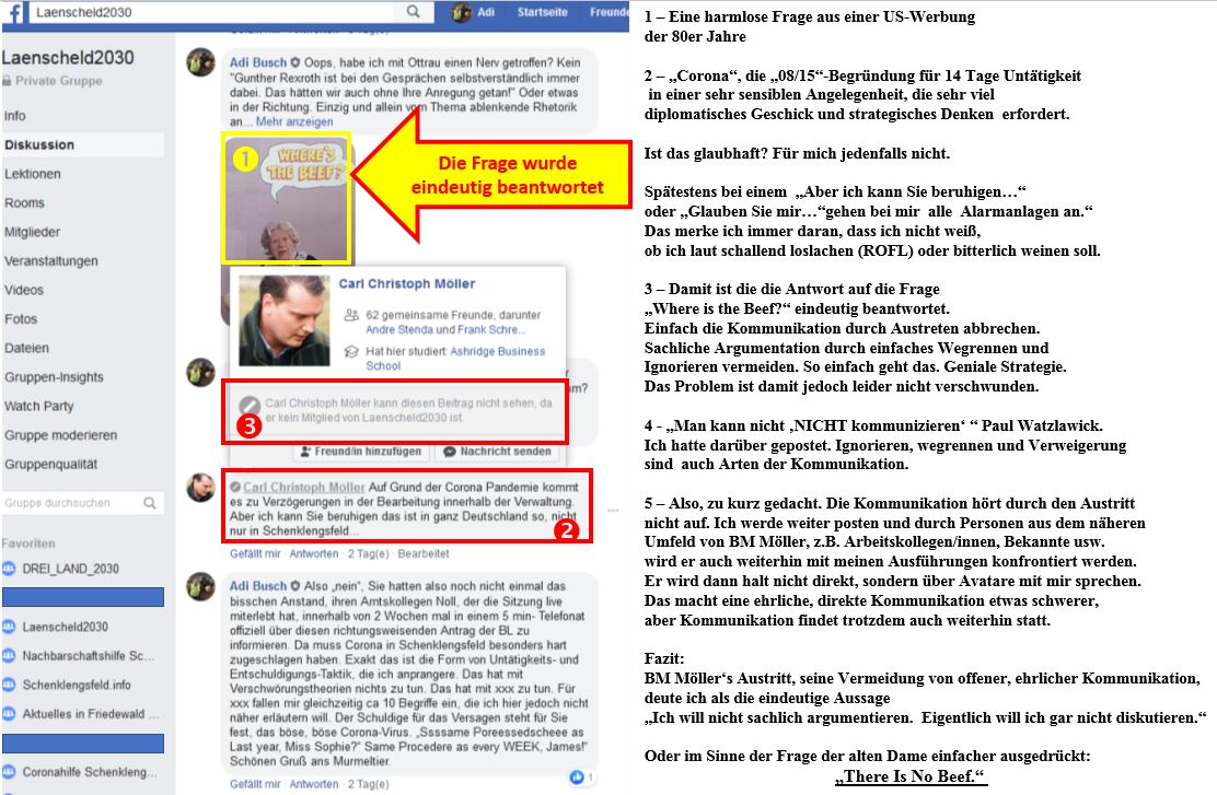 Damit sind die im "Offenen Brief" kritisierten Themen bereits bis zu 3-4 Jahren ein Dauer-Thema. Der Start dieser Erkenntnis war der 20.6.2020 in einem FB-POST auf "Laenscheld2030".