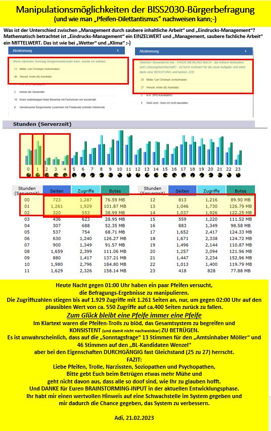ACHTUNG BETRUGSVERSUCH Am 21.2.2023 wurde von Trollen versucht, die Befragungsergebnisse zu manipulieren. Die Dokumentation des Betrugsversuchs ist rechts beschrieben. In der Zwischenzeit wurden alle Werte wieder auf NULL zurück gestellt. Die angezeigten Werte wurden - bei NULL beginnend - seit dem 1.3.2023 gezählt |