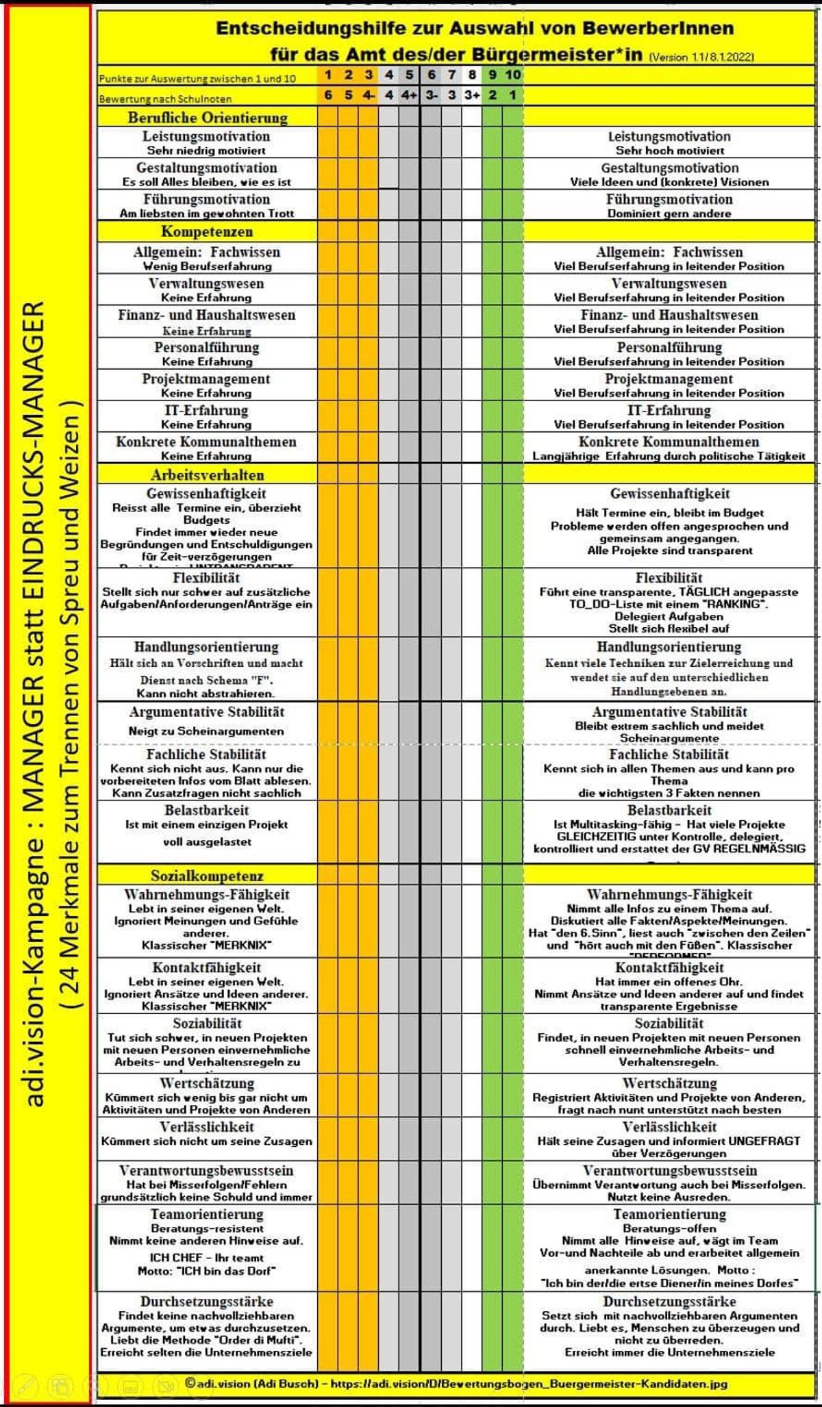 Hier können Sie Ihren Beitrag zu einer Auswertung über charakterliche und fachliche Anforderungen an Manager im höheren Management leisten. Das Amt eines/r BürgermeisterIn ist eine Position mit A17-Gehalt, vergleichbare mit einem Vorstands-Posten in der freien Wirtschaft. In der freien Wirtschaft sind solche Checklisten ab gehobenem AT-Gehalt (außer-tariflich) üblich.