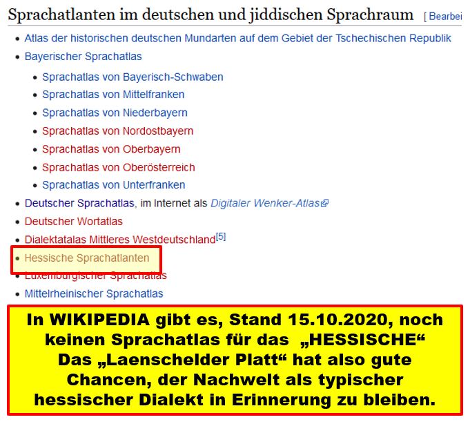 Chancen für Projekterweiterungen | Interessierte Sprachwissenschaftler/-innen z.B. der Gesamtschule könnte mit Schülern*innen ein SPRACHPROJEKT" starten. 1 - Muttersprachler/-innen finden, die noch "Platt schwatze kenne". 2 - Mustersätze erarbeiten 3 - Sprachaufnahmen machen 4 - Eine AUDIOTHEK des "Laenschelder Platt" anlegen Anmerkung: Das "Platt" anderer Ortsteile/Dörfer tickt nach anderen Regeln. Dort gibt es andere Lautverschiebungen. Für "Ihr zwei" sagt man "Ey zwo" und ein Dort weiter "Ey zwä". In Alsfeld gibt es sogar "Ey Zwi". Damit sind automatisch zwei Frauen gemeint. |
