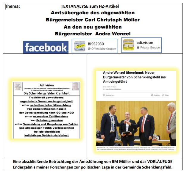 25.04.2024 | HZ | BM Möller JC Eisenberg Adi Busch | Abschließende Selbst-Beurteilung der Arbeit von 2018-2014 durch Bürgermeister Carl Christoph Möller | Für das PROFILING-PORTAL: Selbsteinschätzung vs. Fremdeinschätzung Faktenchecks und Hintergrund-Infos zu den Aussagen im Text | |