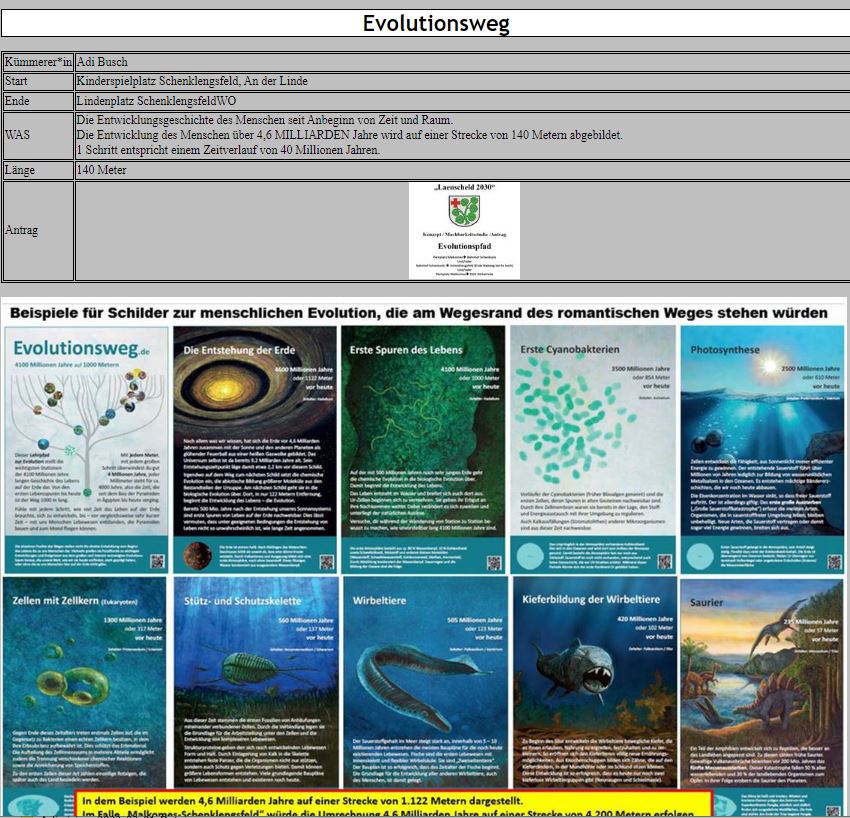Die Errichtung eines "Evolutionsweges" war eine Idee, die Adi Busch in 2018 als neue Attraktion für Schenklengsfeld ausgearbeitet und vorgeschlagen hatte. Vorstand und GV waren sich prinzipiell einig darüber, dass es eine gute Idee sei. Die Idee ist dann auf dem "Verwaltungsweg" ganz elegant ausgebremst wurden.