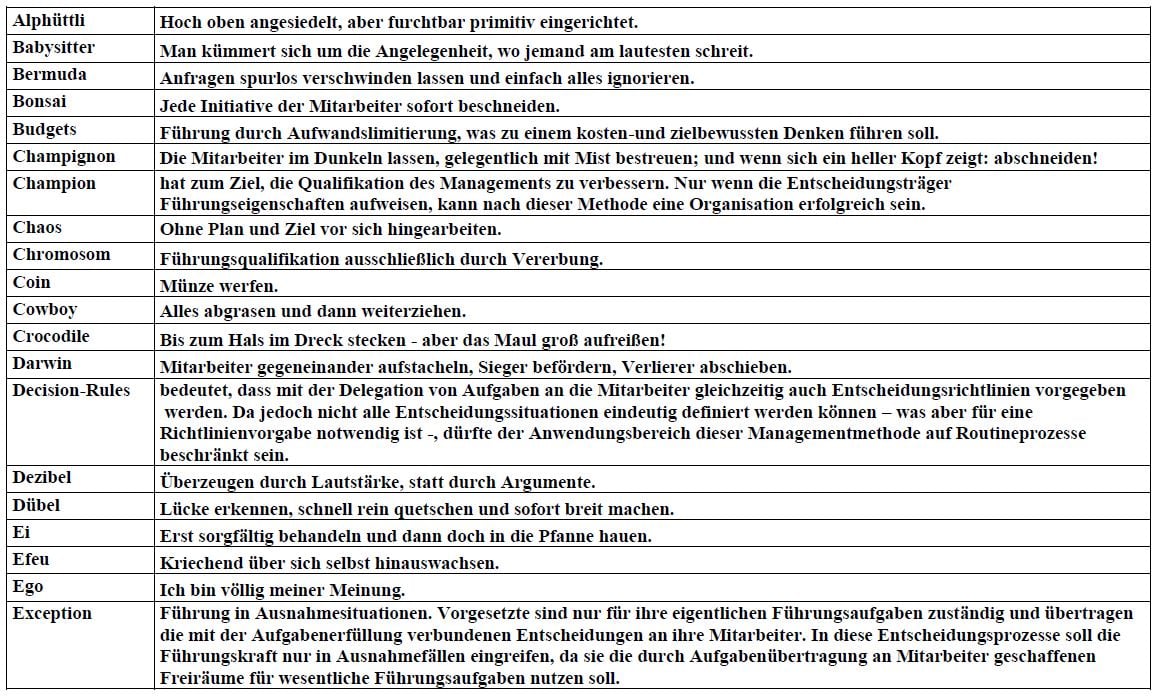 Im Laufe der Zeit habe ich mir eine kleine Liste von Beschreibungen angelegt, die in verschiedenen meiner Projekte das Kernproblem sichtbar gemacht haben. Dazu habe ich gängige Lehrbegriffe aus dem Management-Training (Management by…) je nach Projektsituation erweitert und im Team diskutiert.