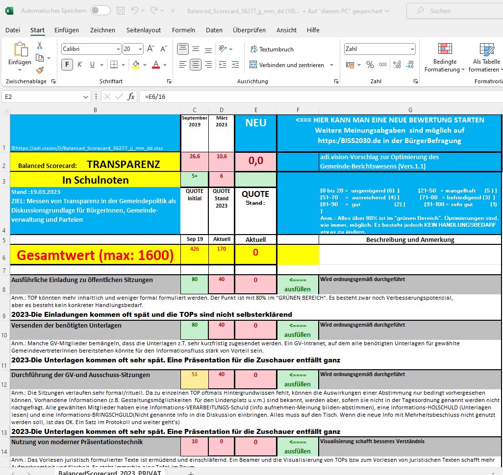 EXCEL-Vorlage als Beispiel für eine EIGENE BALANCED SCORECARD Die MUSTER-Vorlage soll Ihnen einige Ideen geben, wie Sie sich in anscheinend "unerklärbaren Situationen" ein Hilfsmittel erstellen können, mit dessen Hilfe Sie über einen längeren Zeitraum hinweg FAKTEN schaffen können. Die "Balanced Scorecard" ist eine gute Möglichkeit, die Sachlichkeit, Ehrlichkeit und den Charakter von Menschen zu "messen". Ganz einfach: Wenn jemand die BSC-Messtechnik ohne irgend einen Ansatz von Diskussion SOFORT ablegt, gibt er zu, dass er an FAKTEN keinerlei Interesse hat und lieber im Trüben fischt. Weitere Informationen zu solchen Menschen finden Sie im PROFILING-Portal