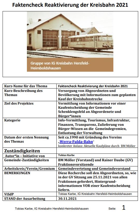 RISIKO-ANALYSE Teil 1: Die Bestandsaufnahme Im ersten Teil der RISIKO-ANALYSE werden alle bekannten FAKTEN gesammelt, strukturiert und nach verschiedenen KATEGORIEN dargestellt. ZIEL der Phase 1 ist es, UNWIDERLEGBARE FAKTEN zusammen zu stellen. Diese Fakten werden dann im ZWEITEN SCHRITT, der RISIKO-ANALYSE, ABSOLUT TRANSPARENT und NACHPRÜFBAR in Bezug auf die KOSTEN erweitert. Dieses MUSTER-BEISPIEL wurde in 36277 Schenklengsfeld im Zusammenhang mit Plänen zur Reaktivierung einer in den 90er Jahren stillgelegten Eisenbahnstrecke empirisch ausgetestet. | |