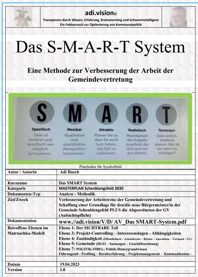 Das "SMART-System" ist eine "Version 1" für einen "MASTERPLAN 2030" für Gemeinden. Hier werden Vorgänge in der öffentlichen Verwaltung mit Techniken aus dem PROJEKT-MANAGEMENT zusammen geführt. |